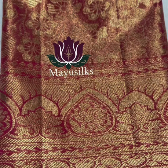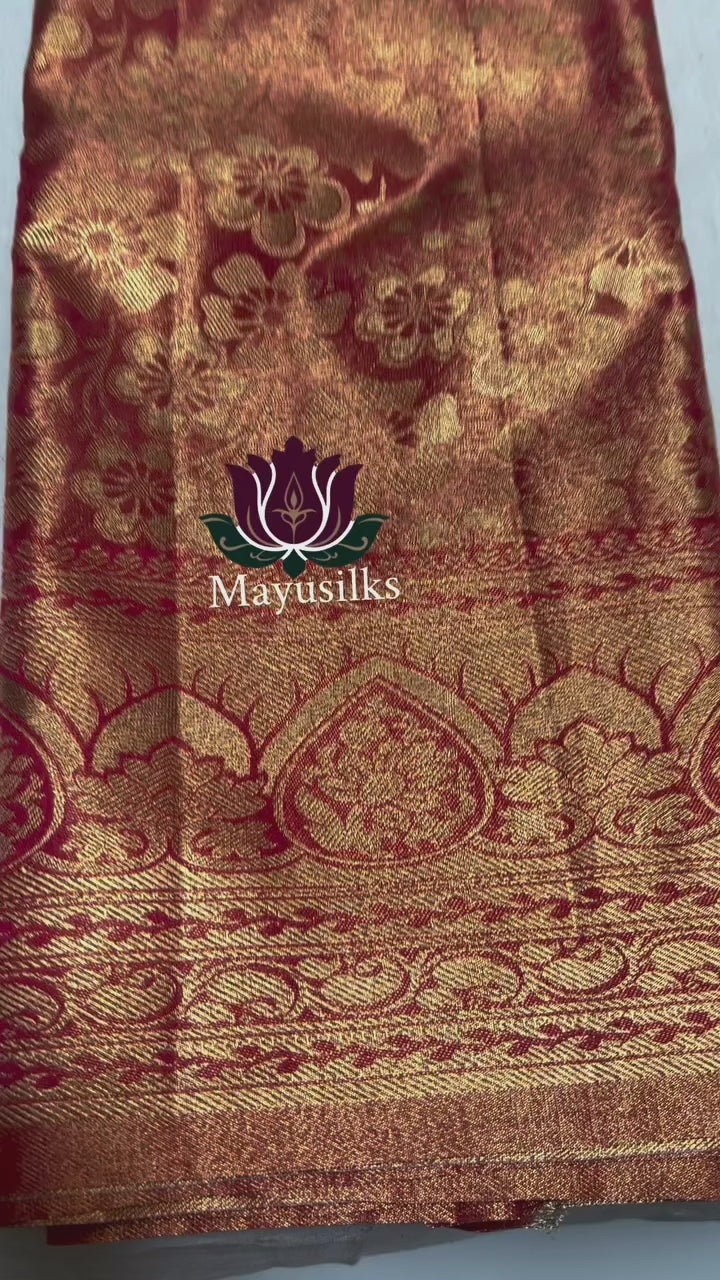 Presenting a beautiful Art silk saree in red with gold threaded weaving and floral design.