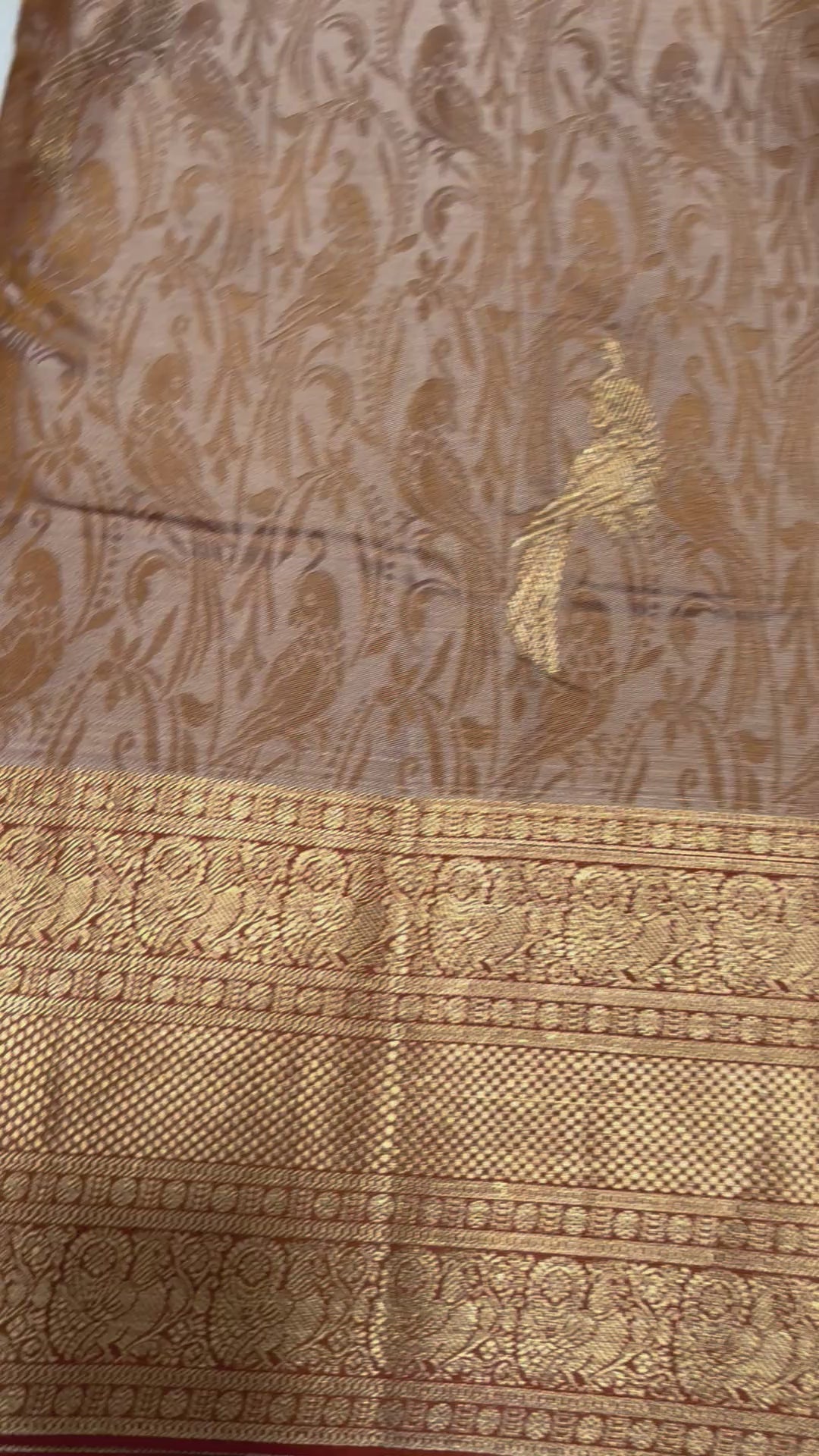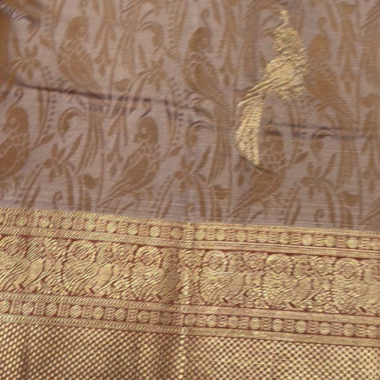 Presenting a beautiful dark beige silk saree with embossed parrot motifs and brocade design all over.
