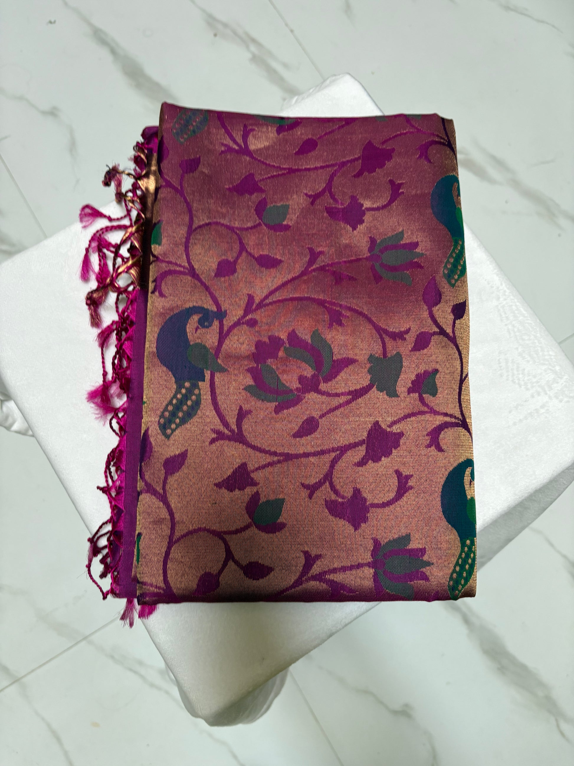 Fancy kanjivaram soft silk saree in dual tone purple colour with the trending paithani design all over the body. Saree borders are medium sized gold zari border and pallu edges have beautiful tassels to it.
