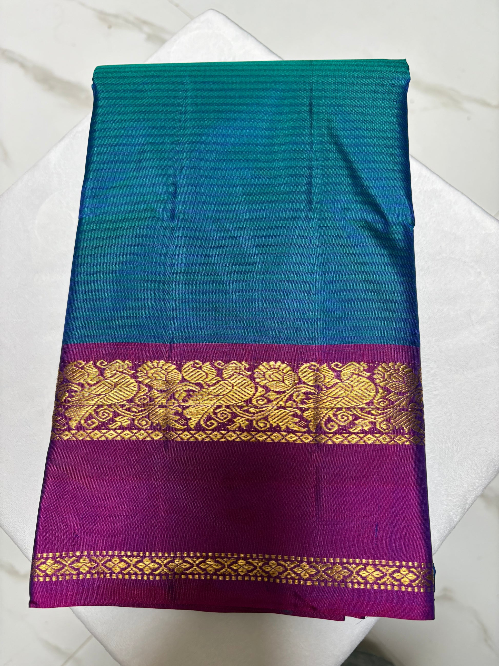 Traditional handloom small border self striped blue saree with majenta border having series of Annam zari and one line zari.