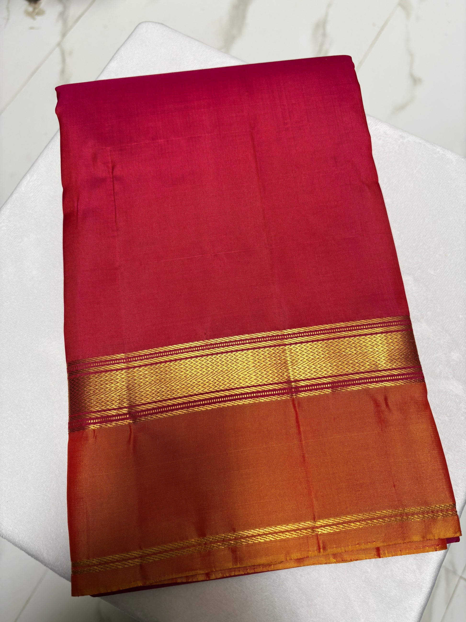 Traditional plain reddish pink kanchivaram saree with light mustard colour getti border and thin two line border.