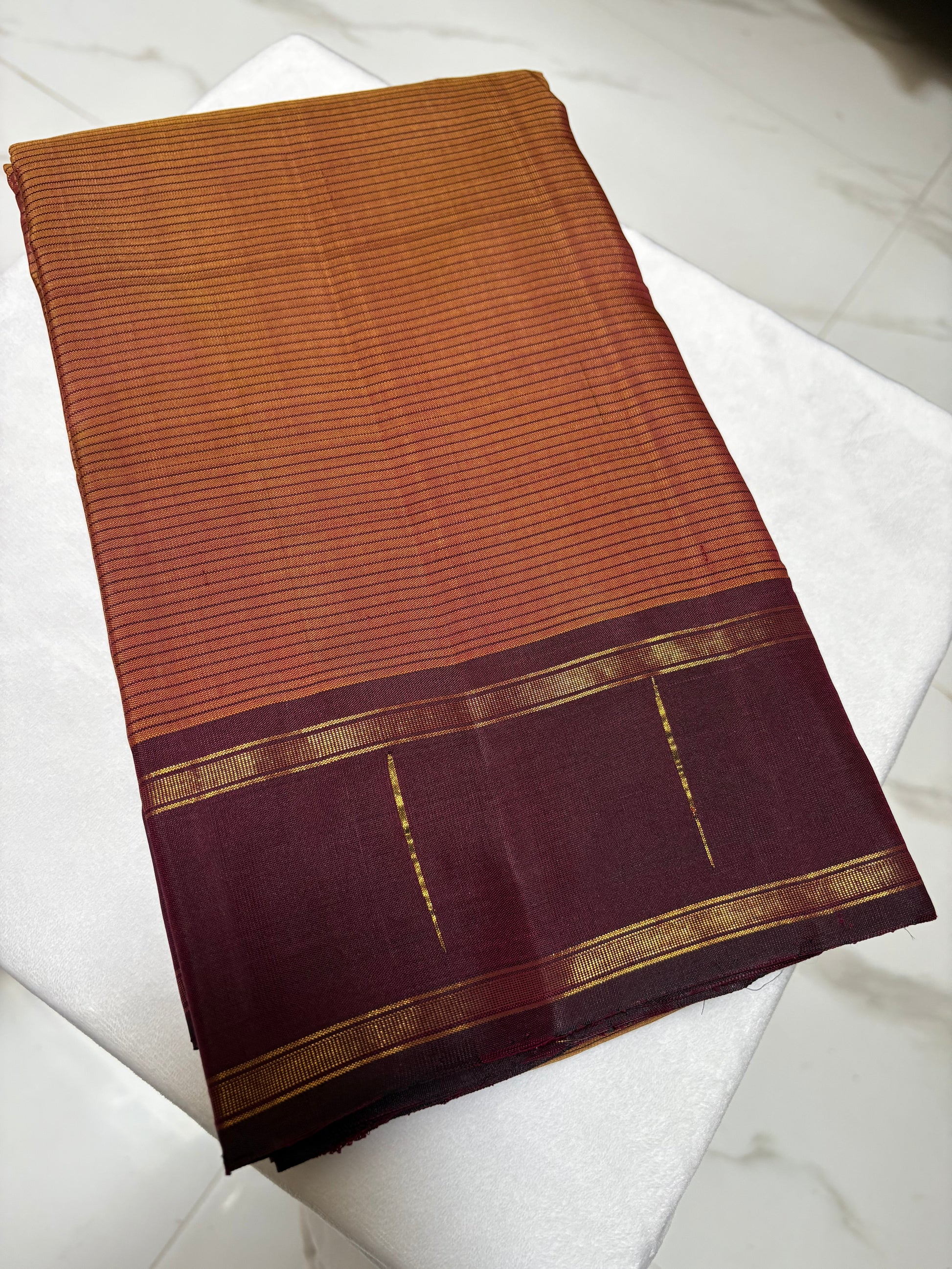 Traditional Kanjeevaram pure zari saree in honey colour with maroonish brown plain border along with paithani drops and two line zari.