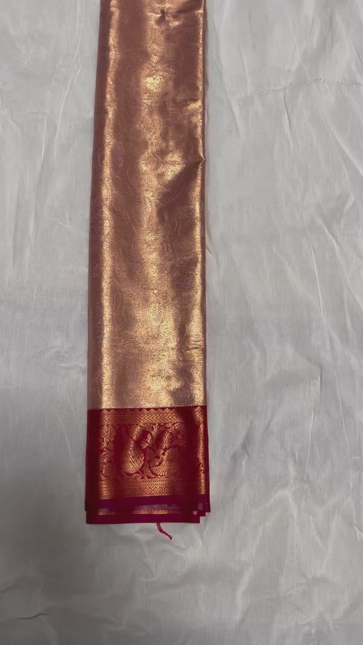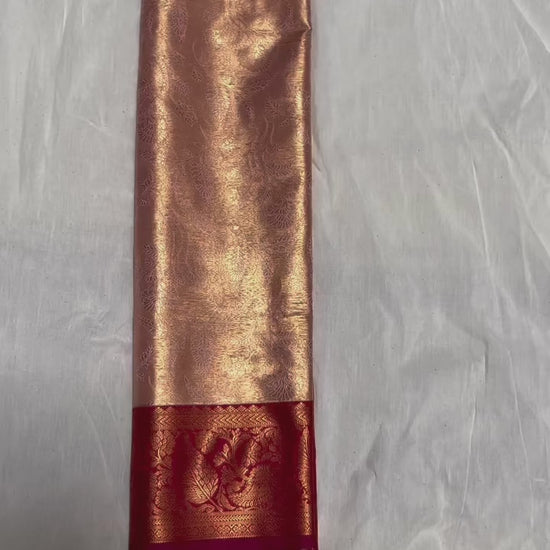 Presenting beautiful art tissue saree in contemporary colour combo of peachish gold and red with jacquard weave design all over the body.