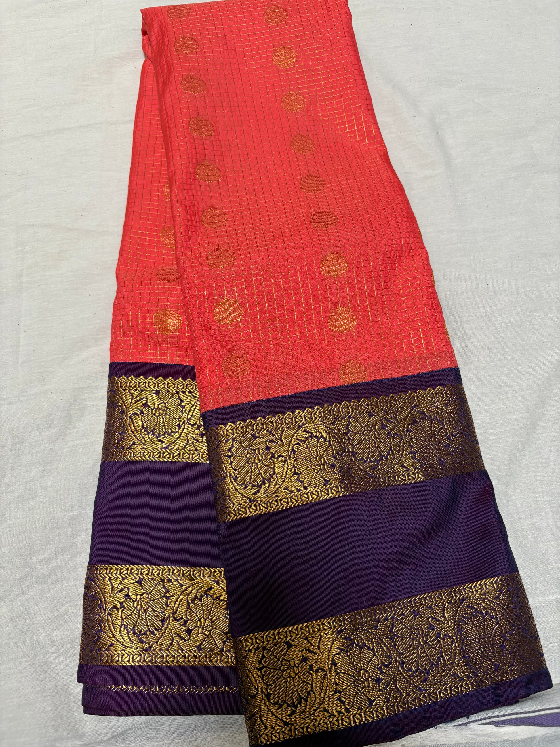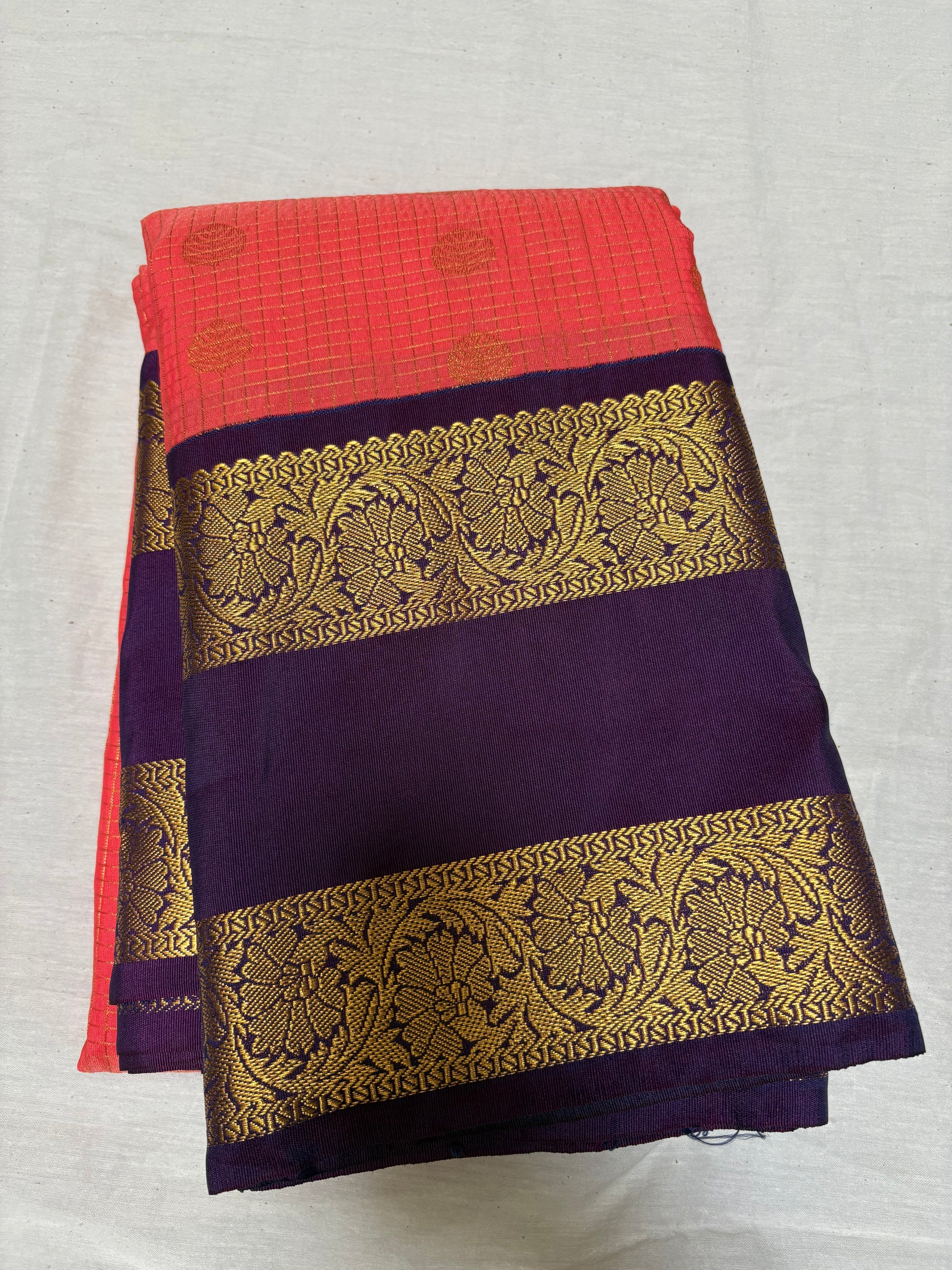 Peach colour with zari check design all over comes with dark purple rettai pettu border.